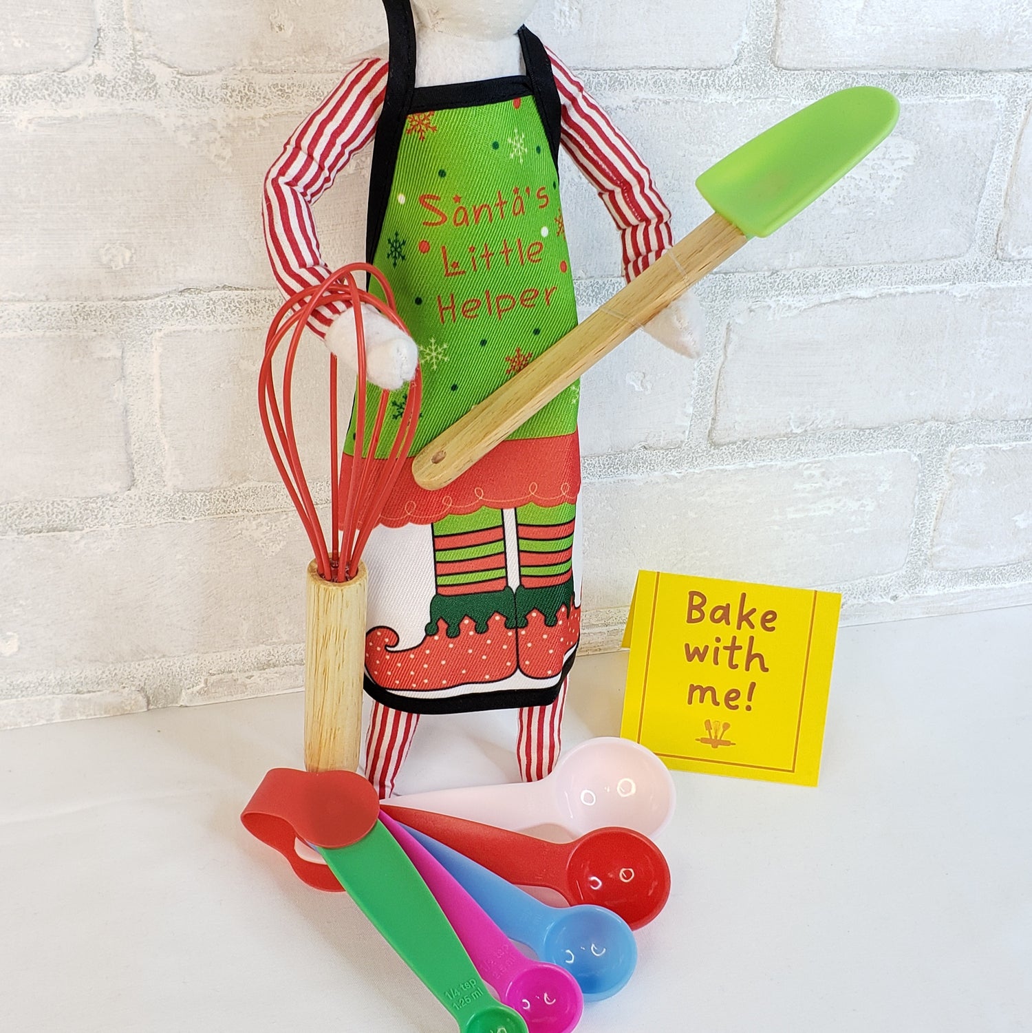 - "Santa's Little Helper" - Elf apron + kid sized utensils (whisk, spatula + measuring spoons), plus 1 sign (other side of sign says "Baking Lessons" OR
