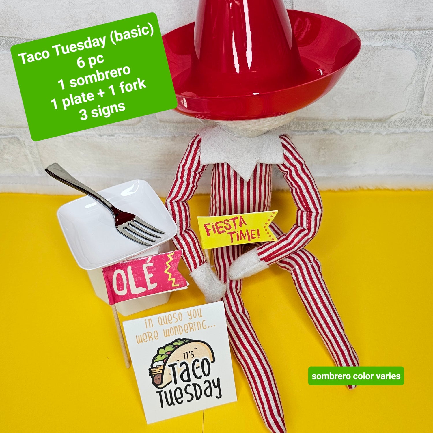Of course your elf needs to get in on that Taco Tuesday! You can use the plate, fork and sign for other nights too! The back of the Taco Tuesday sign is blank chalkboard paper so you can add a message for another night too. This Deluxe set includes a wearable serape poncho for the elf and themed confetti!