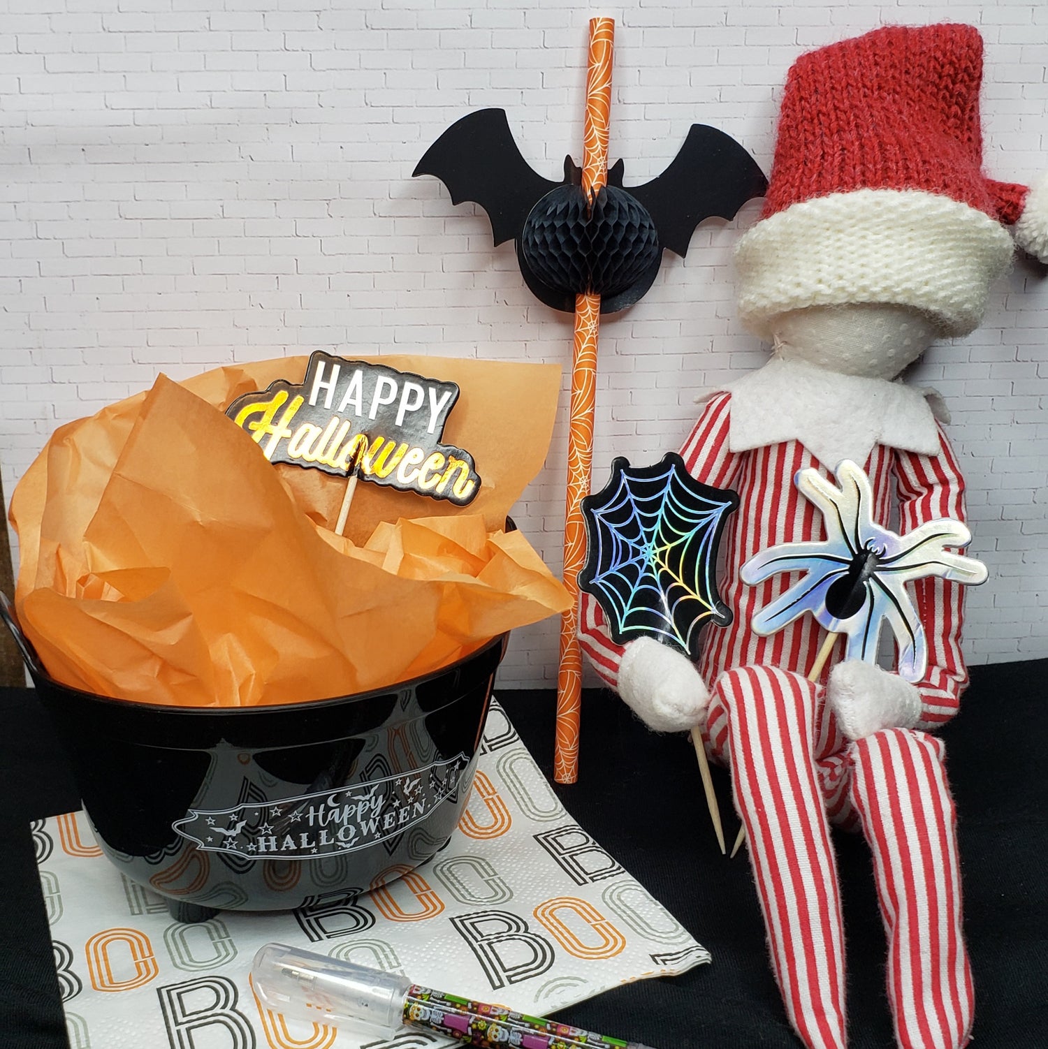 - "Happy Halloween" cauldron with orange tissue (could also be used to hold candy)