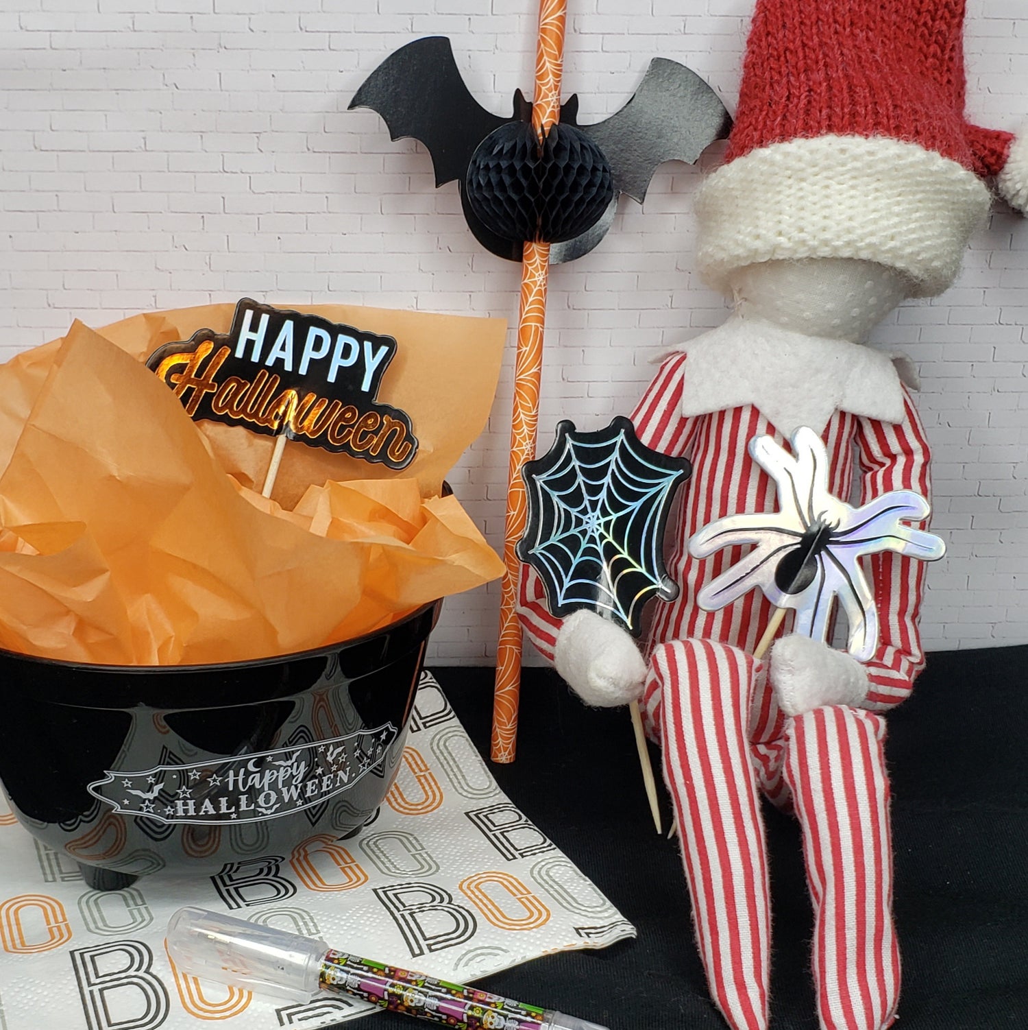It never hurts to have a little visit now and then. And the best part? This set includes 2 little gifts from your elf - a paper straw (with a bat) for your kiddo to use with their favorite drink AND an elf-sized pen! The signs can be held by the elf or stuck in Halloween treats.